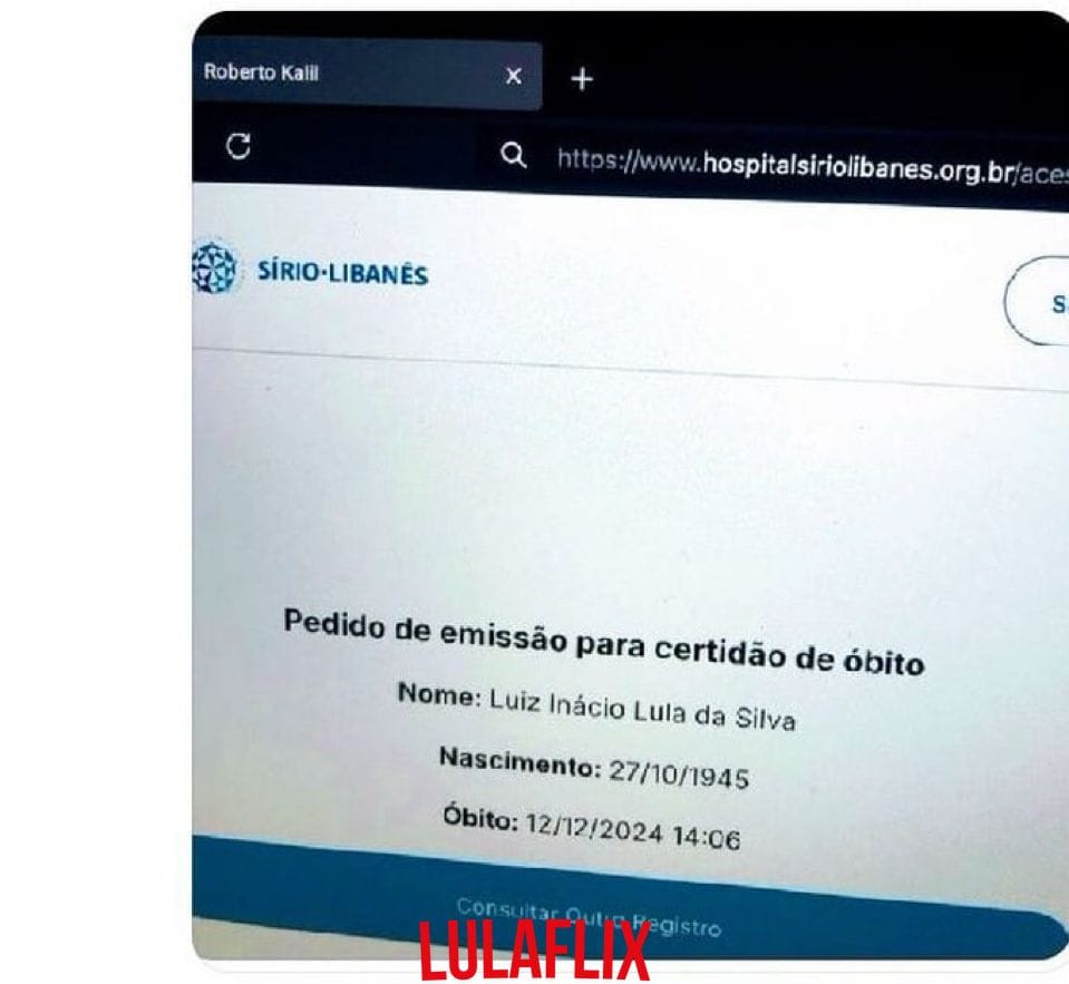 Circulam informações falsas sobre a morte do presidente Luiz Inácio Lula da Silva após uma hemorragia cerebral. De acordo com o Hospital Sírio-Libanês, onde Lula está internado, o quadro de saúde do presidente é estável. Ele permanece consciente, conversa normalmente e está se alimentando.