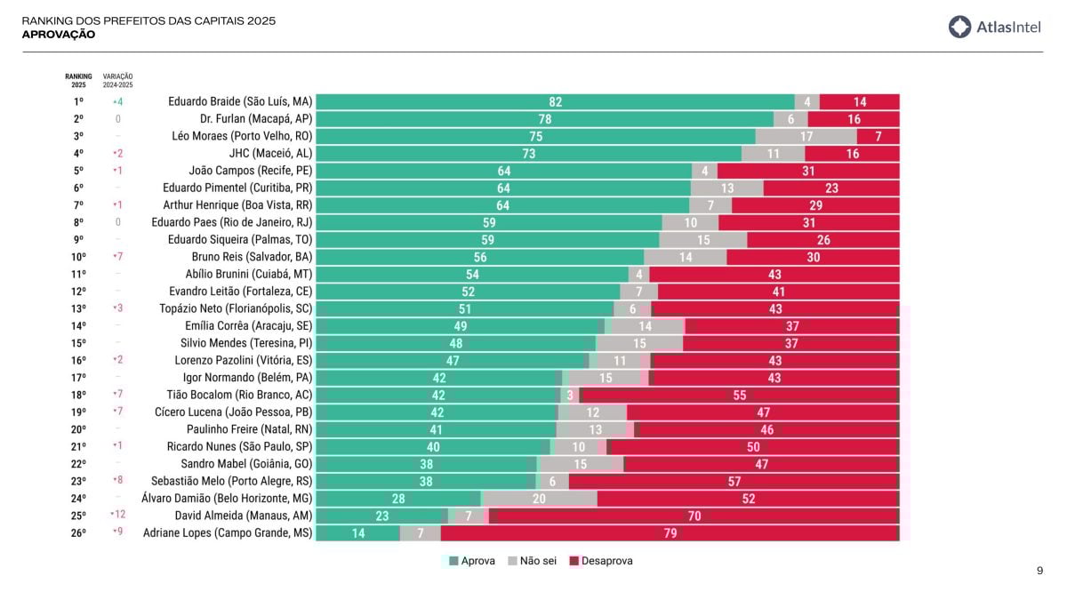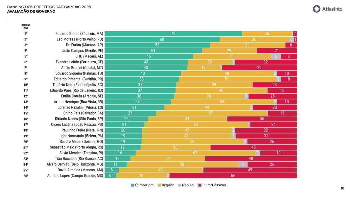 Uma pesquisa AtlasIntel divulgada nesta sexta-feira 19 aponta que Eduardo Braide (PSD), de São Luís (MA), lidera o ranking de aprovação entre os prefeitos de capitais. Ricardo Nunes (MDB), à frente de São Paulo — a maior cidade do País —, amarga apenas a 21ª colocação.