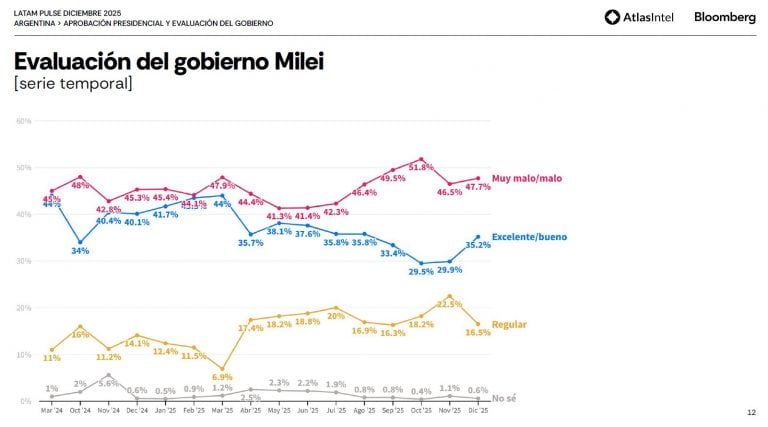 O governo argentino também teve leve evolução no quesito aprovação. O cenário geral, no entanto, ainda é negativo. São 51,6% que desaprovam a gestão de Milei na Argentina (eram 52% no mês passado). A aprovação atinge 44% dos entrevistados (eram 42,6% em novembro).