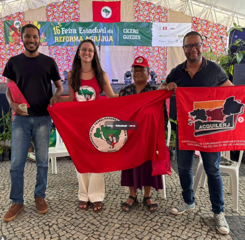 O seminário teve a mesa composta por Mateus Santos, dirigente nacional do MST-RJ; José Emílio, vice-presidente da ACQUILERJ; e mediado pela Gabriela Haua do setor de Formação do MST-RJ, reunindo vozes de diferentes territórios – assentamentos, quilombos e favelas, dentro de um dos eixos principais da feira: a produção de alimentos saudáveis como expressão concreta da Reforma Agrária Popular. Mas, como lembraram alguns participantes, a luta por terra também é disputa por memória, identidade e existência.