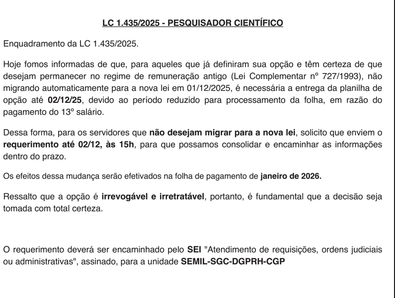 Na prática, os pesquisadores foram colocados diante de uma escolha forçada, com um prazo que a própria lei não prevê. O atropelo contrasta com o texto da LC 1.435/25, que determina um prazo de 90 dias corridos para que o servidor manifeste, formalmente, se deseja permanecer no regime anterior. A escolha é irrevogável e irretratável. Quem não se manifestar automaticamente migra para o subsídio.