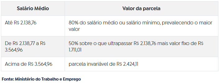 A parcela do seguro-desemprego é calculada com base na média das três últimas remunerações do trabalhador antes da demissão. Após a correção das faixas salariais, o benefício será definido da seguinte forma: