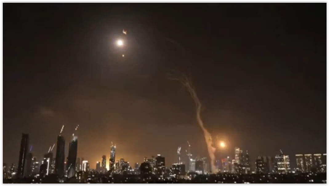 Contra-ataque do Irã, lançando mísseis sobre Tel Aviv, capital de Israel. Imagem: redes sociais