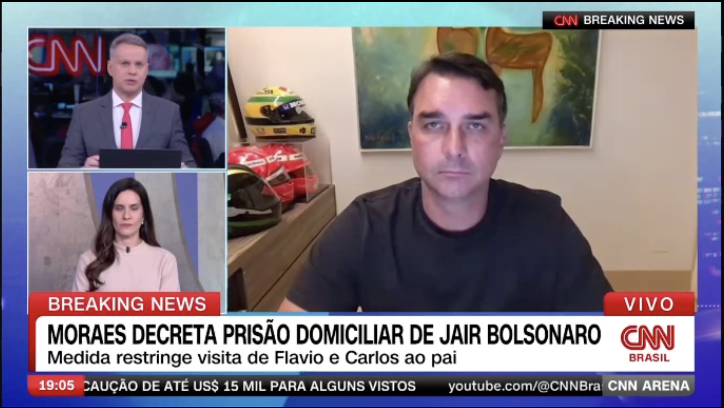 Ao ser informado pelo âncora de que Moraes se baseou na publicação de Flávio em suas redes, transmitindo imagens do pai, ele reagiu com um explícito “Puta que pariu”.